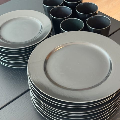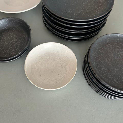 9 stk fat, 6 stk små skåler, 2 medium skål, 2 stk serverings bolle, 1 stk stor bolle.