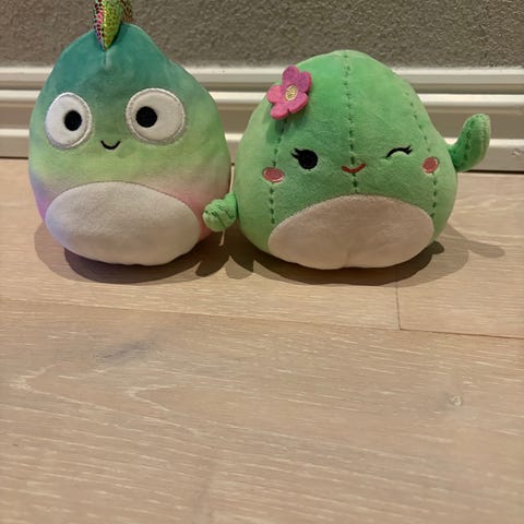 Squishmallows flipmallows. Ikke lekt med, kun stått til utstilling. Figuren har hvit mage, brodert ansikt med ett øye som blunker, rosa kinn og en rosa blomst på siden av hodet.