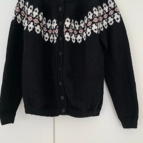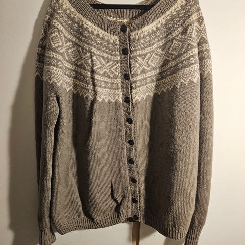 Koften heter Gammel Sandvik. Den er strikket i Rauma Finull. Lite og pent brukt. Overvidde 114 cm, lengde 58 cm og ermer 43 cm. Kan sendes mot porto (bruker bare posten), eller hentes i Tromsø.