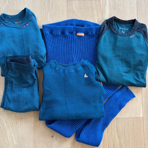Devold ullpakke selges 💙 inneholder 3 bodyer (2 med 80 prosent merinoull og 1 med 100 prosent merinoull), en bukse i 80 prosent merinoull, og en heldress i 100 prosent merinoull.