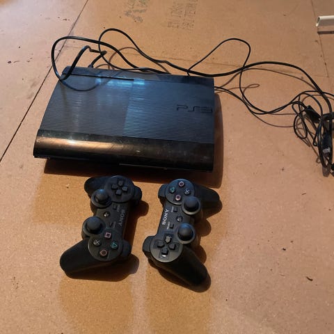Sony Playstation 3 konsoll med tilhørende trådløs kontroller. 1 kontroll i god stand, og følger med 3 til i varierende stand.
