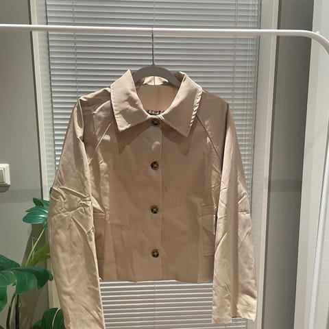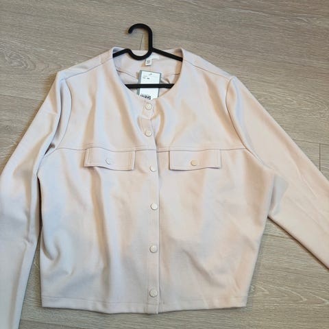 Acne Studios jakke for dame i størrelse M. Jakken er beige med lys kontrastkrage og har lange ermer. Den er laget i ull og polyestermiks. og har frontlukking med knapper samt brystlommer med klaff. Passer som en lett ytterjakke eller mellomlag i kjøligere vær.