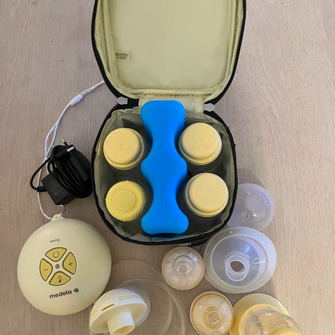 Medela brystpumpe sett med masse tilbehør. Settet inneholder flere brysttrakter av typen Medela PersonalFit Flex i ulike størrelser (1sett helt ny ikke åpnet), flasker og oppsamlingsdeler, strømledning, slanger og smådeler til pumpen. Det følger med en svart Medela-veske med flere rom og glidelåslommer til oppbevaring av pumpe og utstyr, samt isolerte kjølebagger til oppbevaring av morsmelk (den ene er merket Medela, den andre merker Ardo). Egner seg til pumping og oppbevaring av morsmelk hjemme eller på farten. Alle deler som er i kontakt med melk er i plast/silikon beregnet for formålet.