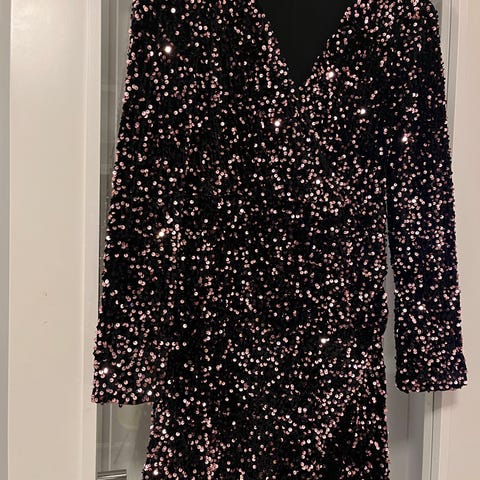 ONLY festkjole for dame i størrelse XS. Kjolen er flerfarget med paljetter og har lange ermer. Passer til fest og andre anledninger der man ønsker en paljettkjole med iøynefallende uttrykk. Selges da den dessverre ikke passet meg. Lapp tatt av, kun prøvet ikke brukt.