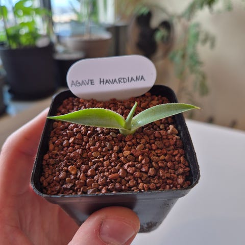 Agave grønn potteplante i plastpotte. Planten har kraftige, spisse blader med lett taggete kanter og grønn til blågrønn farge. Egner seg som inneplante på lyse steder, gjerne med direkte sollys. Trives i godt drenert jord og bør vannes moderat, med tørking mellom vanningene. Passer i vanlig inneromstemperatur og kan også settes ute i frostfrie perioder på et lunt og solrikt sted.