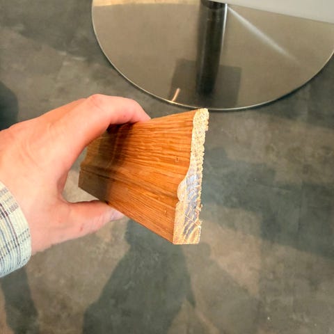 Gulvet er demontert svært varsomt. Det var limt i skjøtene med sprøtt lim og er derfor forsiktig knekt løs. Skjøtene fremstår intakte, men det anbefales å se over og gå lett over/rense profilene før montering – helt normalt ved gjenbruk.