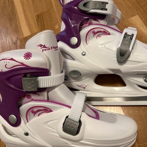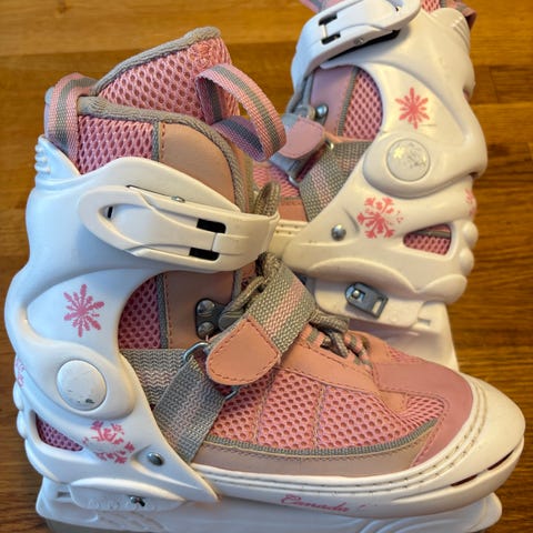 Stuf justerbare barneskøyter i størrelse 29-32. Skøytene har varm og myk, polstret innersko og justerbar lukking med snøring, spenne og borrelås for god passform.