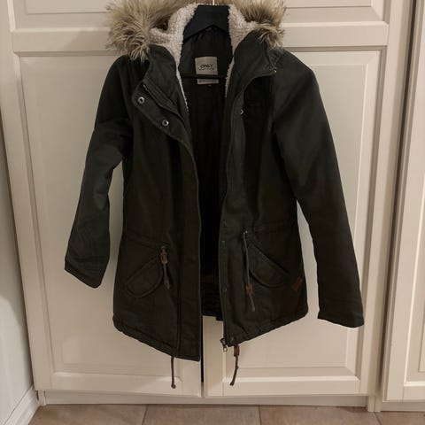 ONLY lang jakke for dame i størrelse M. Jakken er svart og laget i polyester. Modellen er en lang, vattert ytterjakke med hette og gjennomgående glidelås foran. Den har lange ermer og rekker godt ned på leggen, noe som gir god dekning på kalde dager. Passer som hverdagsjakke og yttertøy i kjøligere vær.
