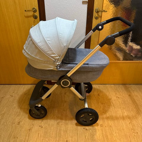 Følger med en organisator fra Tinkafu i svært lik grå farge som vognen. (Har lekket en vannflaske i den, se bilde, men fortsatt fullt brukbar.)