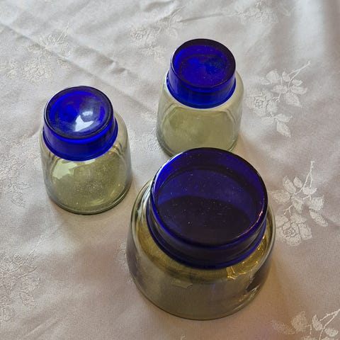 Den blå, høyde 10cm dia.10,5cm. Kr.500.