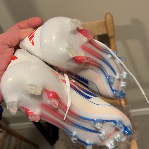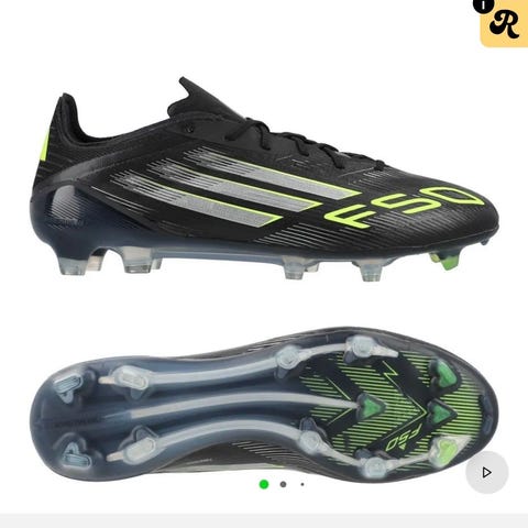 Adidas F50 fotballsko i lilla og grønn farge. Modellen har overdel uten tradisjonelle lisser for en jevn overflate mot ballen. Skoene leveres med innleggssåler og oppbevaringspose i matchende design.