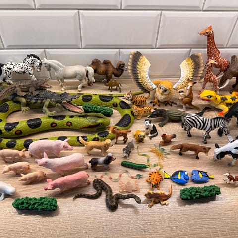 Samling med dyrefigurer . Inneholder et stort utvalg ville dyr, husdyr, sjødyr, reptiler og insekter i ulike størrelser og farger. Figurene forestiller blant annet løver, tigre, giraffer, elefanter, hester, kyr, griser, sauer, krokodiller, slanger, frosker, sjøpattedyr og flere andre arter. Egner seg til lek, rollelek og som støtte i læring om dyr og natur. Figurenes høyde og lengde varierer, og detaljnivå og farger kan variere mellom de ulike dyrene.