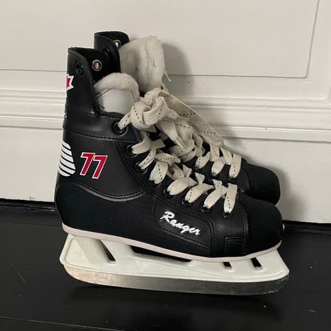 Reaper 77 ishockeyskøyter for barn i størrelse 35. Modellen har svart overdel med hvite lisser og hvit skøytestålholder.