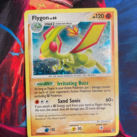 Pokémon samlekort med motivene Flygon, Psyduck, Mudkip og flere andre Pokémon. Kortene er standard størrelse samlekort i farger. Egner seg til samling eller som spillkort i Pokémon Trading Card Game. Det følger med flere kort i én pakke, som vist på bildene.