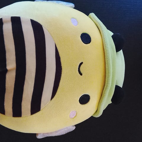 Squishmallows kosedyr formet som en bie i gul farge med sorte og gule striper på magen. Mykt og polstret plysjleketøy som kan brukes som kosedyr eller pute. Passer for barn som liker myke figurer og samler på Squishmallows.