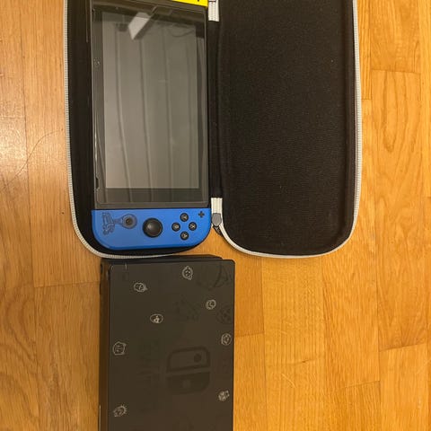 Nintendo Switch Fortnite Edition spillkonsoll med tilhørende dokkingstasjon og Joy-Con-kontrollere i blå og gul. Konsollen kan brukes både håndholdt og tilkoblet TV via dokken. Medfølgende tilbehør på bildene inkluderer bæreetui, Joy-Con-grepsholder, strømadapter og HDMI-kabel. Bildene viser også to fysiske spillkassetter til Nintendo Switch. Dette er en standard Nintendo Switch-modell tilpasset Fortnite-pakken, med trådløse Joy-Con-kontrollere som kan brukes festet til konsollen eller separat.