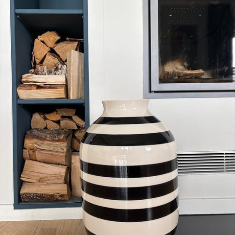 Kähler Omaggio jubileumsvase i keramikk. Vasen har klassisk Omaggio-form med horisontale gullfargede striper på hvit bakgrunn. Egner seg til snittblomster, grener eller som dekorativt objekt alene. Leveres som 175-års jubileumsutgave fra Kähler.