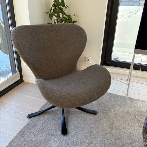 Selger en meget pent brukt stilig stol med god sittekomfort og sving. Stolen har en moderne form som passer godt inn sammen med de fleste stiler og vist i tekstil Glore - ett trendy teddystoff som minner om saueskinn i strukturen og er myk og behagelig å sitte i. 35 kg kaldskum i sete.