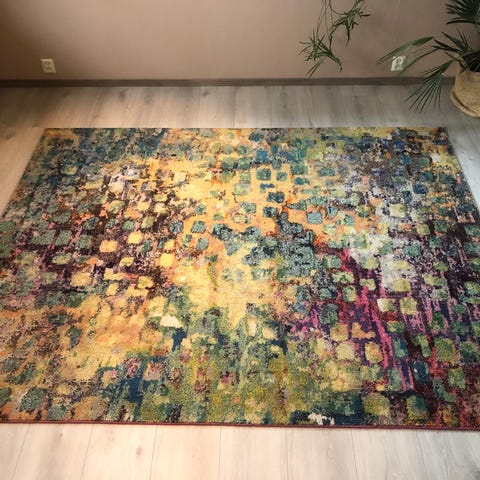 Stort moderne gulvteppe i turkis, rosa og lillatoner.