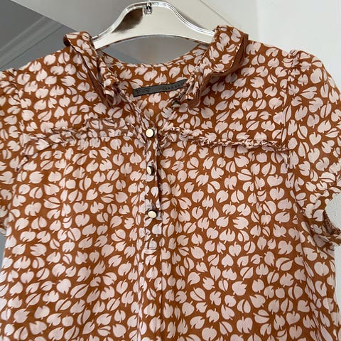 MAUD bluse (55% lin 45% viscose) med nydelig fasong i størrelse 36. Blusen har små mønstrede detaljer i sort og oransje på lys bunn. Den har lange ermer med mansjetter med knapp, samt knappelukking i ryggen. Fin stolpekant i halsen, men kan også brukes «bak frem» slik at man får knappeåpningen foran. Behagelig kvalitet, og som ny, trenger bare lett stryking.