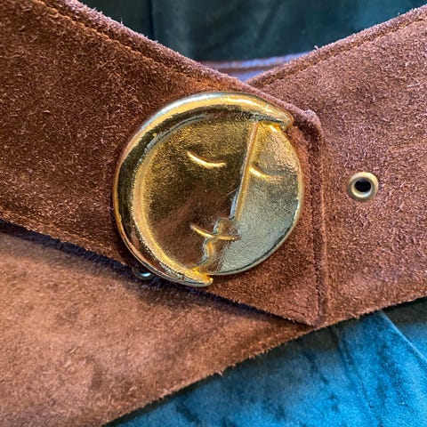 Beltet har ingen merkeangivelse. Beltet er ca. 90 cm frem til første hekte + 12 cm til den siste. ▶️Beltet er i litt lett plast og hele beltet framstår litt "lett", og det har lett for å virre seg litt rundt seg selv når det ikke er på, men vi synes likevel at beltet er megastilig på grunn av designet og hvor tidstypisk det er◀️