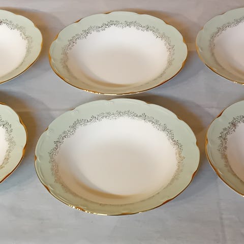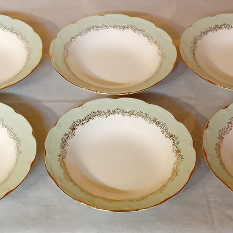 Har også 3 suppetallerkener fra Allegro Katedral serien som jeg har brukt som supplement til servering, fordi de er så like. Disse er penere i gullkanten. Tar 150 kr for de samlet.