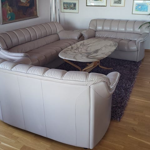 Selger pent brukt norskprodusert salongsett i ekte skinn. Settet består av 3-seter, 2-seter, lenestol og puff. Alle sitteplasser har manuell balanse-recliner – man lener seg enkelt bakover uten spak eller knapp.