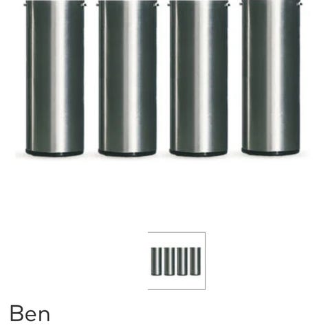 8 stk Jysk sengeben i metall i grå farge. Sengebena har sylindrisk form med skruefeste på toppen for montering i seng eller ramme. Egner seg som støtteben til seng eller andre møbler som er tilpasset denne typen feste.