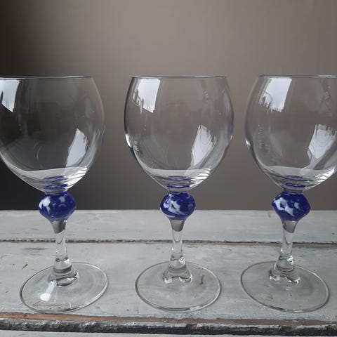Tre pene og hele franske vinglass med blå stett.