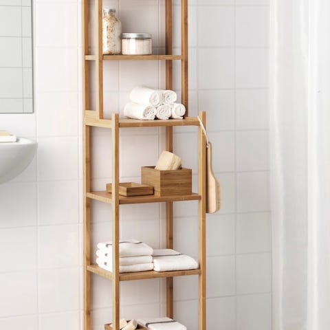En svært romslig og praktisk baderomshylle som ikke krever boring i veggen og enkelt festes på kranen.