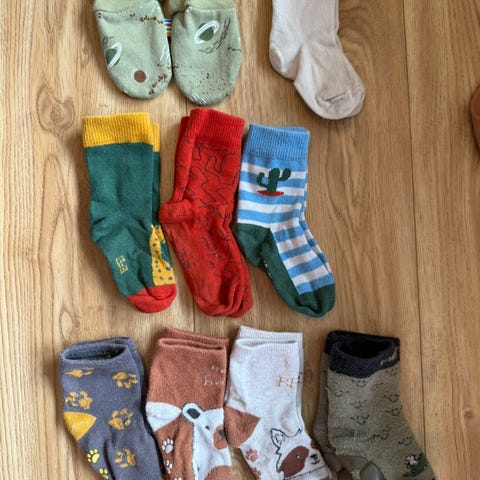 26 par sokker, 3 i ull og 23 i bomull. Ingen slitasje. Alltid vasket med parfymefritt vaskemiddel.