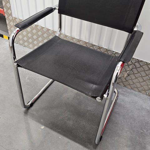Stolen har tuftede detaljer i rygg og sete, brede armlener og klassisk kromfot. Hydraulikken fungerer som den skal – den heves og senkes jevnt og holder høyden fint når man sitter i den.