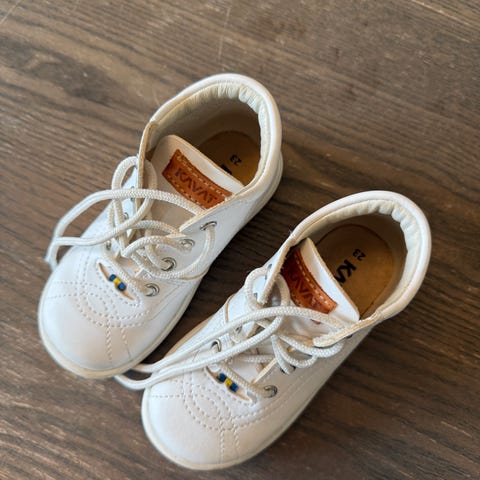 Kavat barnesko off white skinn i størrelse 22 for unisex. Skoene har snøring og overdel i lyst materiale med perforerte detaljer på tåpartiet. Passer til hverdagsbruk for små barn som trenger stabile og lukkede sko til utendørs bruk.