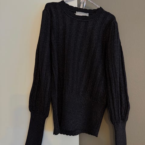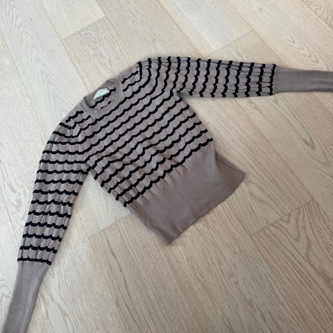 Neo Noir Darly genser for dame i størrelse 36. Genseren er gullfarget med innvevd lurex som gir en lett glitrende overflate. Den har rund hals, ribbestrikket struktur og brede ribbekanter nederst og på ermene. Materialet består hovedsakelig av viskose, med innslag av nylon og polyester for elastisitet og formstabilitet. Passer som en lett strikkegenser til hverdagsbruk eller penere anledninger.