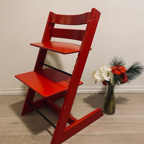 Stokke Tripp Trapp høy barnestol i rød farge. Klassisk trappestol i tre med justerbart sete og fotbrett som kan tilpasses barnets høyde. Stolen er konstruert slik at barnet kan sitte ved vanlig bordhøyde. Egner seg til bruk for barn som kan sitte selv og oppover, avhengig av tilpasning og eventuelt ekstrautstyr.