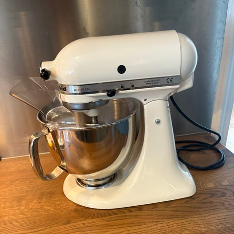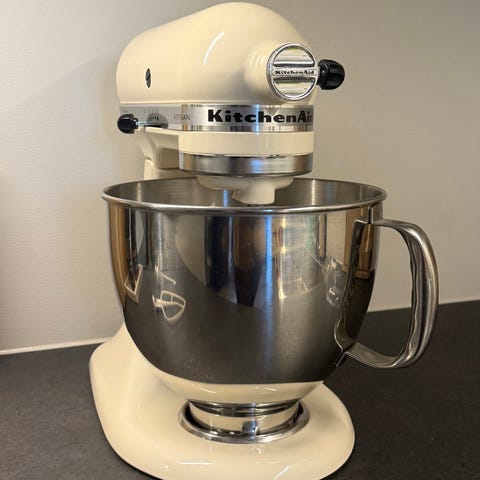 KitchenAid Artisan kjøkkenmaskin i kremfarge med bolle i rustfritt stål. Maskinen leveres med visp, deigkrok og flatvisp, samt sprutbeskytter. Passer til elting av deig, pisking av krem og røring av ulike rører og deiger på kjøkkenet. Konstruksjonen i metall gir stabilitet under bruk, og hastighetsregulering gjør det mulig å tilpasse maskinen til ulike oppgaver.