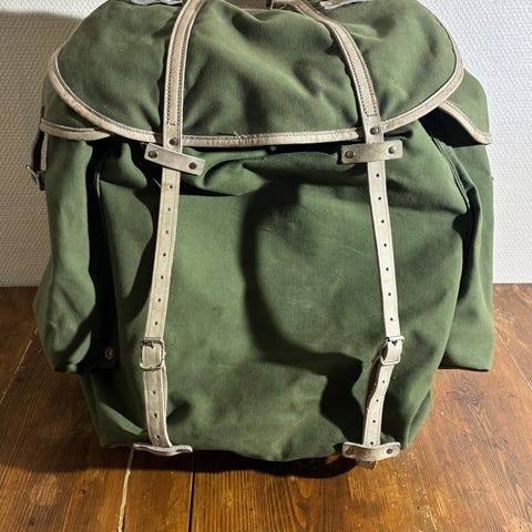 Ryggsekk i canvas i khaki/grønn farge. Sekken har topplokk med reimer og metallspenner, to utvendige sidelommer med spenner samt bærehåndtak på toppen. Justerbare skulderreimer og forsterket bunn i skinn materiale. Egner seg til hverdagsbruk, tur og fritidsaktiviteter.