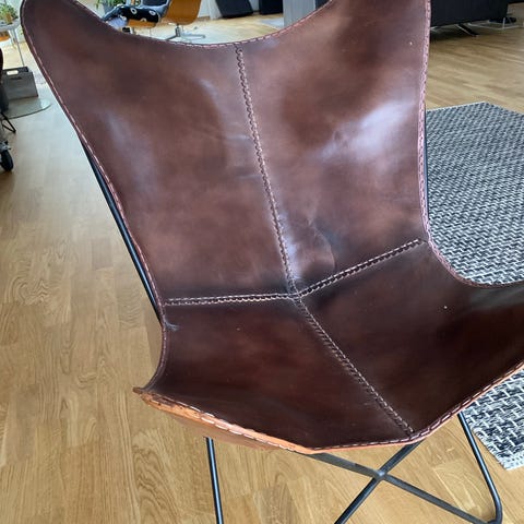 Elegant butterfly stol med brunt skinn og kobber