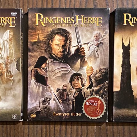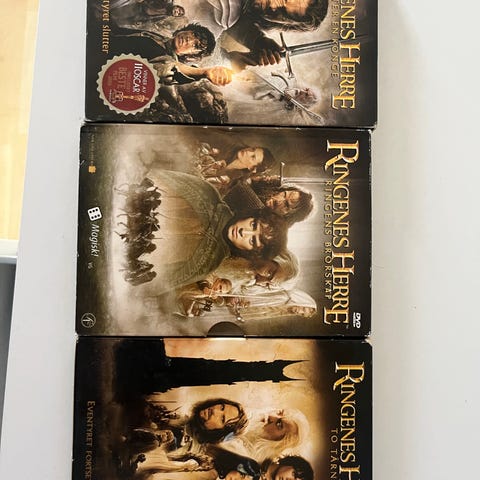 Ringenes herre trilogi DVD bokssett. Inneholder de tre filmene Ringenes brorskap, To tårn og Atter en konge i norsk utgave på DVD. Hver film leveres i egen DVD-eske med norsk tittel og omslag. Egnet for avspilling på DVD-spiller som støtter regionen for denne utgaven. Passer for samlere eller de som ønsker hele filmserien i fysisk format.