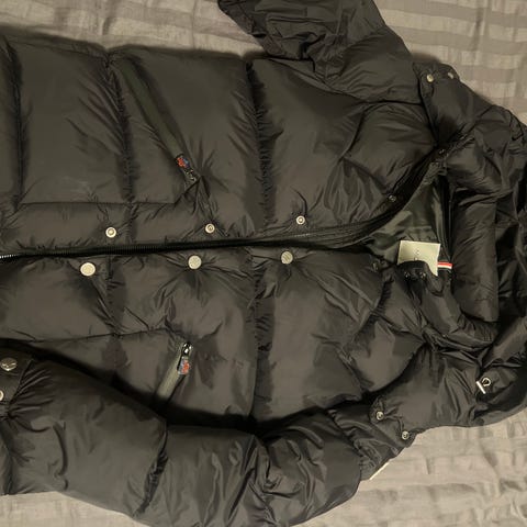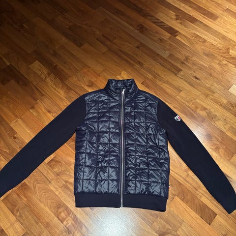 Moncler jakke for herre i størrelse S. Jakken er grå og fylt med dun, armer og rygg i strikk. Den har vattert kropp med glidelåslukking foran og to glidelåslommer i siden. Ermene er strikket i grått med hvite striper og har ribbestrikkede mansjetter. Moncler-logo er plassert på ermet. Egnet som ytterjakke i kjøligere vær.