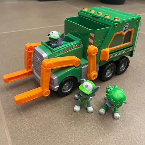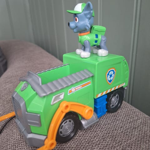 Paw Patrol Rocky lekebil med figur. Lekesettet består av Rockys grønne kjøretøy med hjul og bevegelige deler foran, samt en løs Rocky-figur som kan plasseres i bilen eller brukes separat. Plastleke egnet for barn som liker Paw Patrol og kjøretøylek.