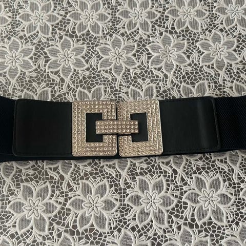 Elastisk belte i retro-stil fra H&M til salgs. Beltet er ca. 69 cm før det strekkes. Strekkes greit til 90 cm, men da er det litt stramt. Bredden på beltet er ca. 6 cm.