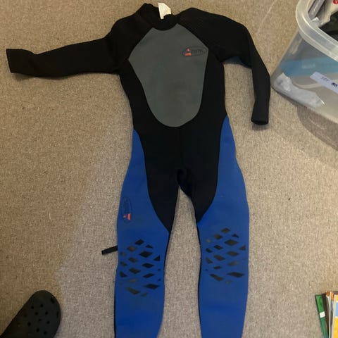 Mira JXL våtdraktsett for barn i neopren. Settet består av en ermeløs lang våtdrakt og en langermet overdel. Fargekombinasjon blå og svart med kontrastsømmer. Størrelse JXL (junior ekstra large). Egnet til bruk i vannaktiviteter som bading, surfing eller andre vannsporter der isolasjon og bevegelsesfrihet er viktig.