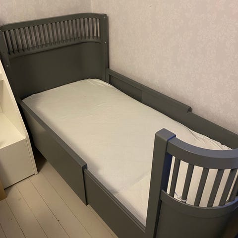 Sebra sengen, baby- og juniorseng i hvit farge. Sengen kan brukes både som sprinkelseng og som uttrekkbar juniorseng, slik bildene viser.