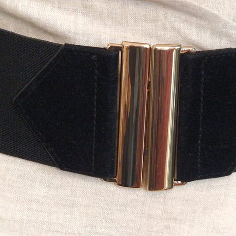 Belte elastisk i retro-stil fra Pieces til salgs. Beltet er ca. 72 cm før det strekkes. Strekkes greit til 90 cm men da er det stramt. Bredden er ca. 7 cm.