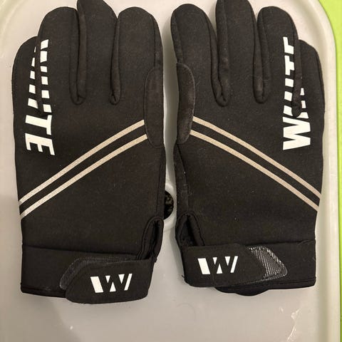 Et par White sykkelhansker i str. XL selges. Hanskene har polstret håndflate og forsterkede sømmer for bedre grep og komfort ved sykling. Justerbar lukking ved håndleddet og hemper ved fingrene for enklere av- og påtaking.