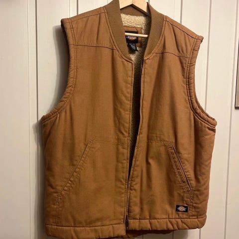 Dickies vest for herre i størrelse L. Vest i svart farge med dunfyll og høy krage. Glidelåslukking i front og quiltet mønster. Passer som ytterplagg eller som et ekstra lag for varme i hverdagsbruk og utendørsaktiviteter.