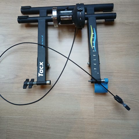 Tacx sykkelrulle med tilhørende Tacx Trainer Tyre 23-622 (700x23c) i blå farge. Sykkelrullen er sammenleggbar og har justerbar motstandenhet bak. Passer til landeveissykkel med bakhjul som bruker 23-622-dekk. Leveres med separat styringsenhet til styret for regulering av motstand under bruk.