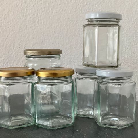- 25 stk. krydderglass: Inkluderer blant annet flere Ikea KORKEN glass med tette lokk, samt glass med sorte skrulokk.