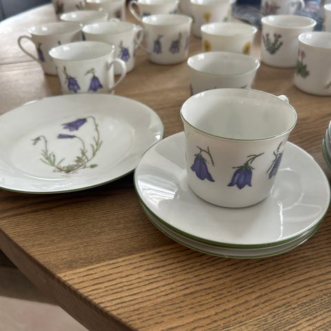 Rypebær sett i serien fjellflora fra Porsgrund porselen Tegnet av Dagny Tande Lid. Diameter asjett 17 cm. Selges 90,- for 3 deler. 60,- kopp/skål. Asjett 40,- Har alle 12 varianter. Sender post.